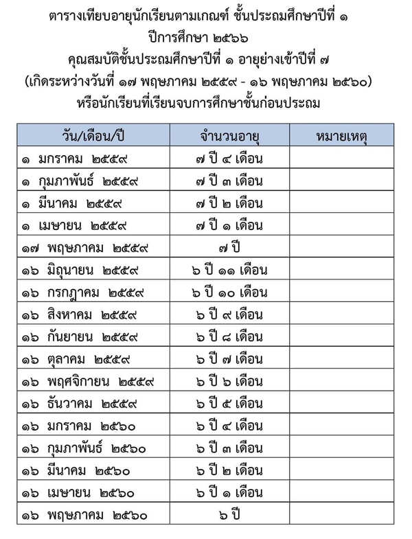 ตารางเทียบอายุเด๊กนักเรียนตามเกณฑ์ ชั้นประถมศึกษาปีที่1